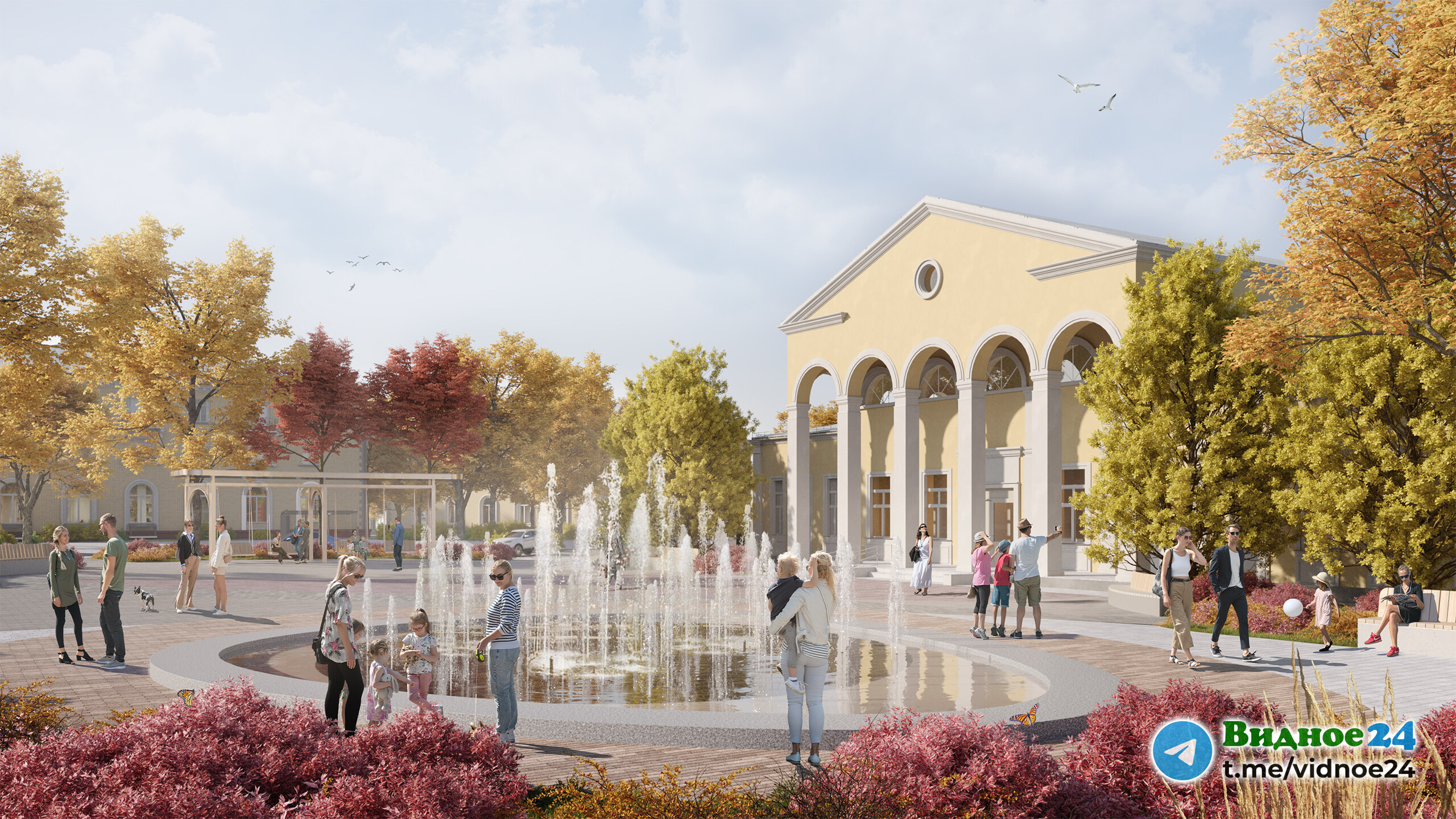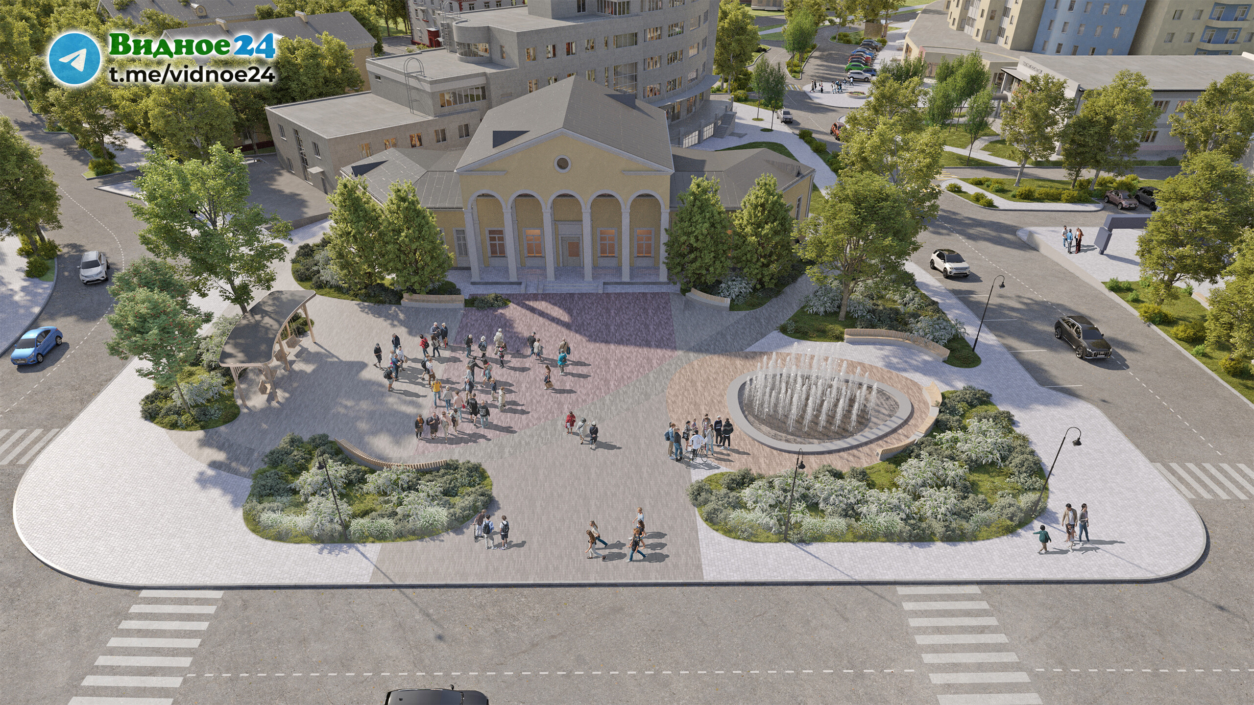 Согласно материалам проекта, большая площадь проезжей части Советской площади перед Историко-культурным центром города Видное превратится в сквер с фонтаном, качелями с навесом, скамейками и современным озеленением. То есть после окончания всех работ Советская площадь будет из себя представлять два сквера: один - новый, перед Историко-культурным центром, и второй - ныне существующий, перед Дворцом культуры с памятником В.И. Ленину, который тоже будет по-новому благоустроен. А разделять эти скверы будет Школьная улица.