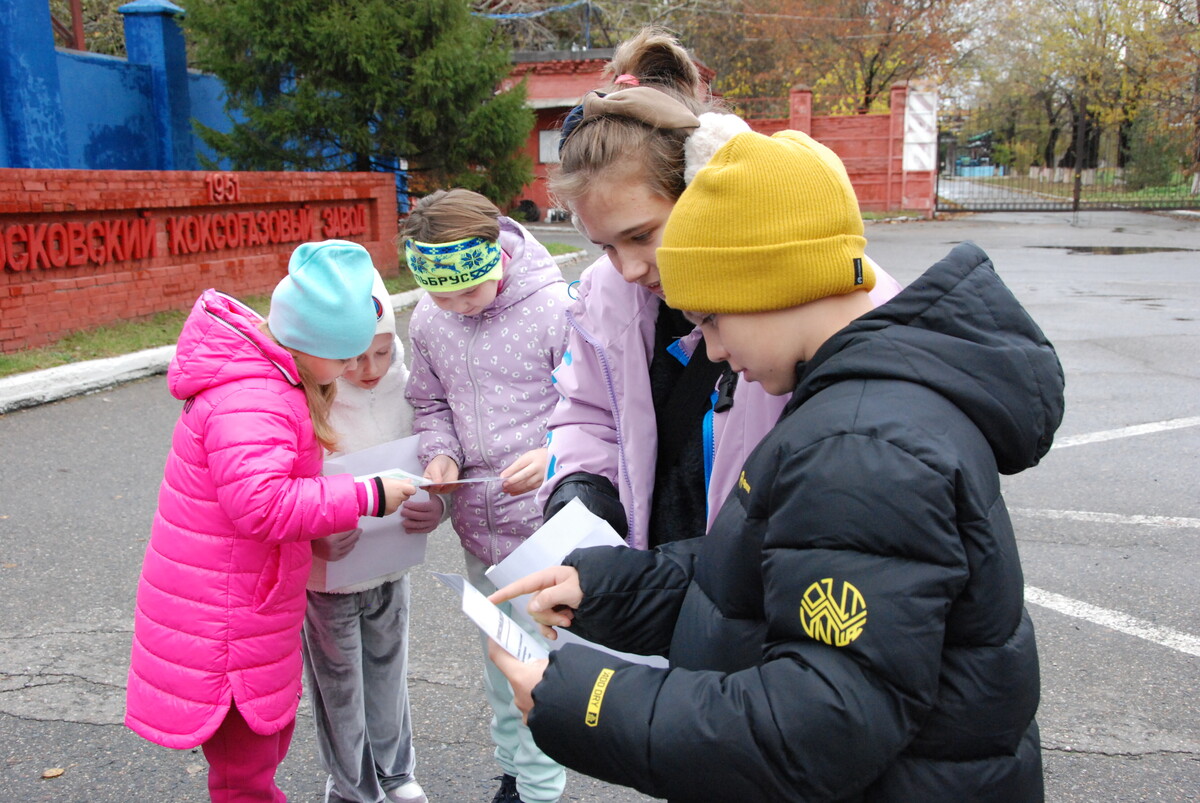 Для этого всех участников поделили на три команды, каждая из которых получила конверт с картой и маршрутом. Согласно маршруту, пролегающему по непроизводственной территории завода, каждая команда должна была побывать на пяти станциях и, выполнив задания, собрать из букв слово, которое укажет, где спрятан «клад». На каждой из станций – «Вагоноопрокидыватель», «Тоннели углеподготовительного отделения», «Коксовый цех», «Отделение улавливания» и «Лаборатория» – детям объясняли, зачем нужно то или иное подразделение, и предлагали выполнить соответствующее задание. Например, в «коксовом цехе» надо было по очереди пройти с завязанными глазами по лабиринту и собрать куски кокса с буквами, из которых должно получиться слово.