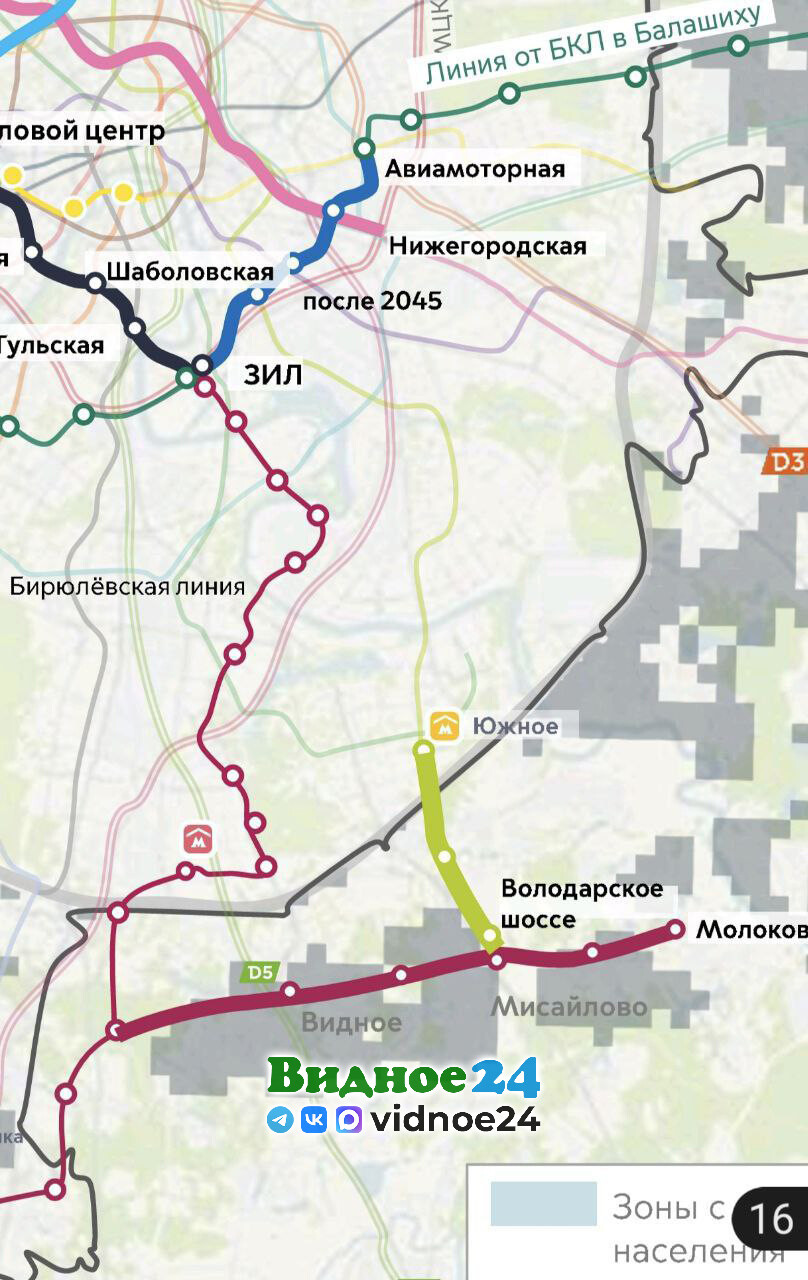 Тематические Telegram-каналы, освещающие информацию о развитии московского транспорта, делятся новыми инсайтами о развитии метро после 2035 года. Теперь они сообщают, что на официальном уровне обсуждается проект строительства новой линии метро от будущей станции Лопатино Бирюлёвской линии метро до села Молоково через город Видное. Также на картах развития метро Люблинско-Дмитровская линия (салатовая ветка) продлена до промзоны города Видное в районе Московского коксогазового завода.