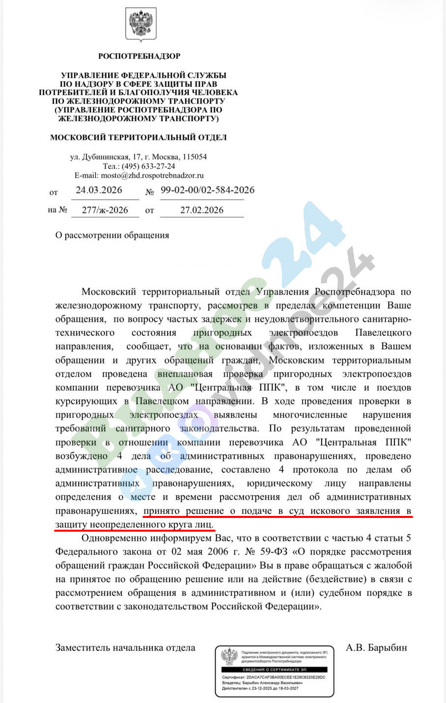 Московский территориальный отдел федеральной службы по надзору в сфере защиты прав потребителей и благополучия человека (Роспотребнадзор) из-за неудовлетворительного состояния пригородных электропоездов Павелецкого направления Московской железной дороги принял решение подать в суд исковое заявление в защиту неопределенного круга лиц.